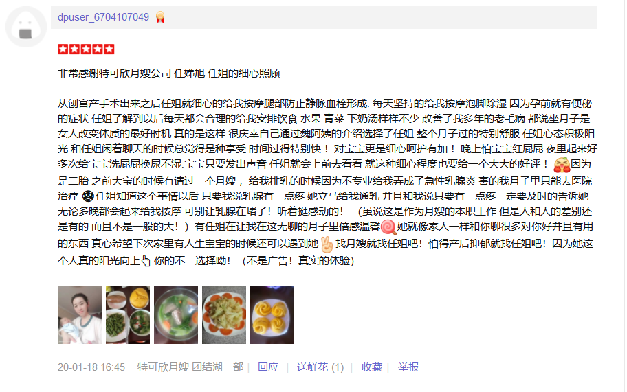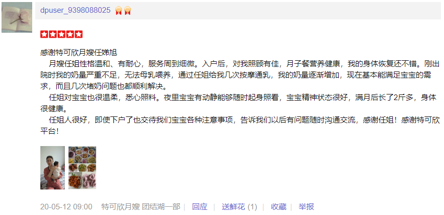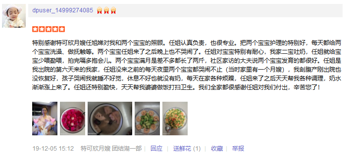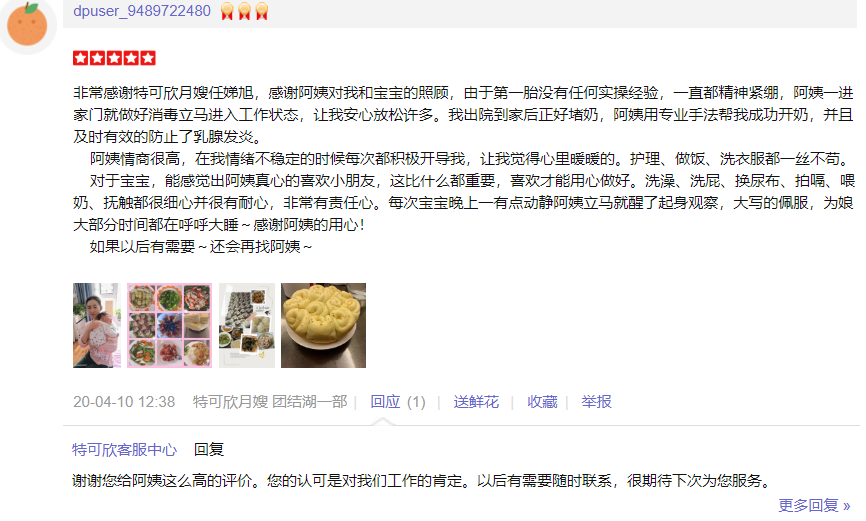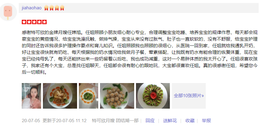 2015年从事月嫂工作,性格温和,有耐心,责任心,爱干净。擅长催乳,月子餐的营养搭配,产妇及婴儿护理专业; 护理过的特殊产妇:产后抑郁,妊娠期糖尿病,高血压等 护理过的特殊婴儿:早产儿,超大儿,吸入性肺炎,泪囊阻塞,结膜炎,肠胀气等 产妇护理技能:月子餐制作,乳房护理,恶露观察,子宫复旧,体形恢复、产褥期的科学指导;心里快乐指导等。 婴儿护理技能:抚触,被动操,排气操,新生儿常见疾病的观察及预防如:黄疸,湿疹,臀红,尿布疹,鹅口疮等,大小便的观察,新生儿早期教育等。