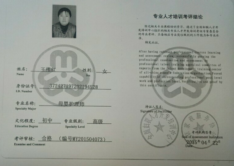 2015年从事月嫂工作,带过28个宝宝,其中护理过试管婴儿、早产儿,性格沉稳,有责任心,喜欢宝宝,善于沟通。 产妇护理技能:月子餐制作,乳房护理,心里疏导,恶露观察,子宫复旧,体形恢复、产褥期的科学指导等。 婴儿护理技能:抚触,被动操,排气操,新生儿常见疾病的观察及预防如:黄疸,湿疹,臀红,尿布疹,鹅口疮等。