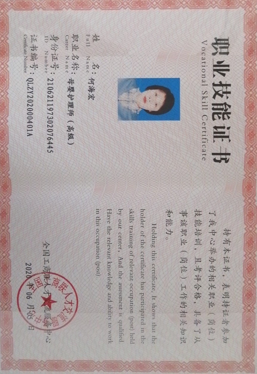 2016年从事月嫂工作,带过20多个宝宝。性格稳重踏实,有爱心 耐心 责任心。擅长产妇及婴儿护理。 产妇护理技能:乳房护理,子宫复旧,恶露观察,产褥期的科学指导,形体及体能康复等; 婴儿护理技能:早教,被动操,排气操,抚触等。 常见疾病的观察如:脐带消毒,黄疸观察,湿疹,臀红的预防与护理等.